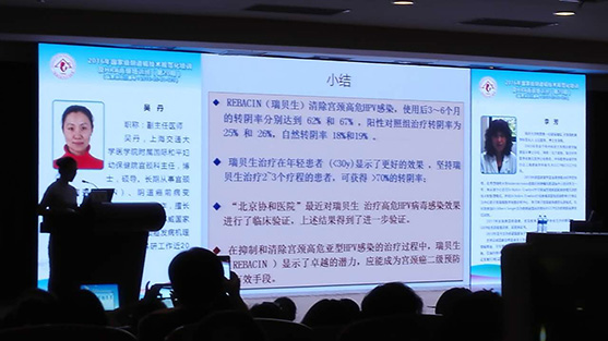 圖2:吳丹主任在介紹“瑞貝生”清除高危HPV病毒感染基礎(chǔ)和臨床應(yīng)用研究成果