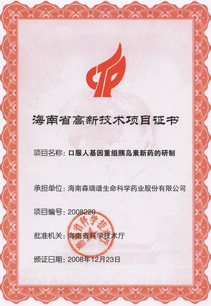 《口服人基因重組胰島素新藥的研制》海南省高新技術項目證書