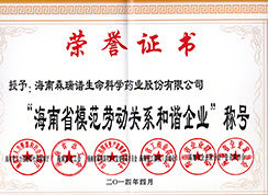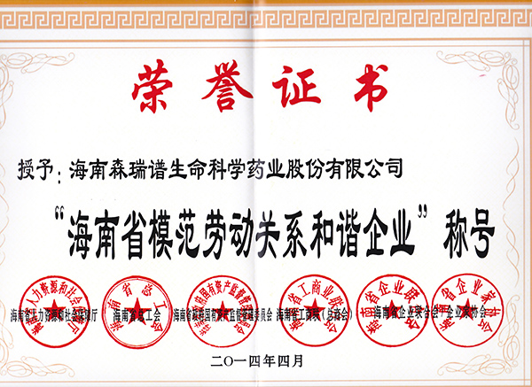 《“海南省模范勞動關系和諧企業(yè)”稱號》榮譽證書