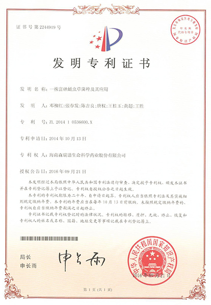 《一株富硒蛹蟲草菌種及其應用》專利證書