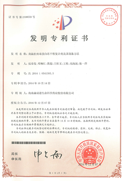 《商陸抗病毒蛋白凍干粉復合劑及其制備方法》專利證書
