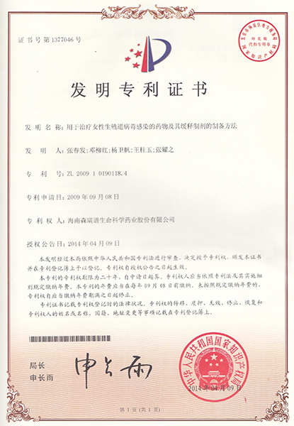 《用于治療女性生殖道病毒感染的藥物及其緩釋制劑的制備方法》專利證書