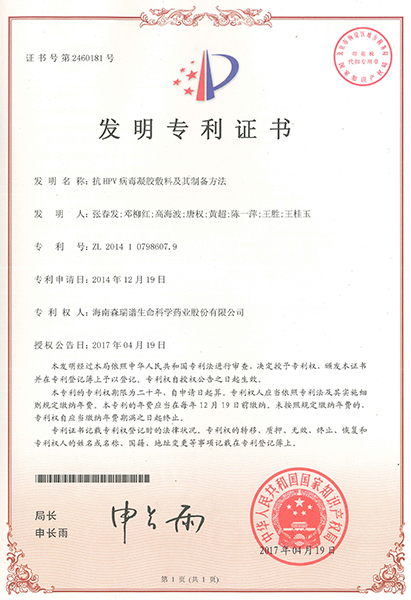 《抗HPV病毒凝膠敷料及其制備方法》專利證書